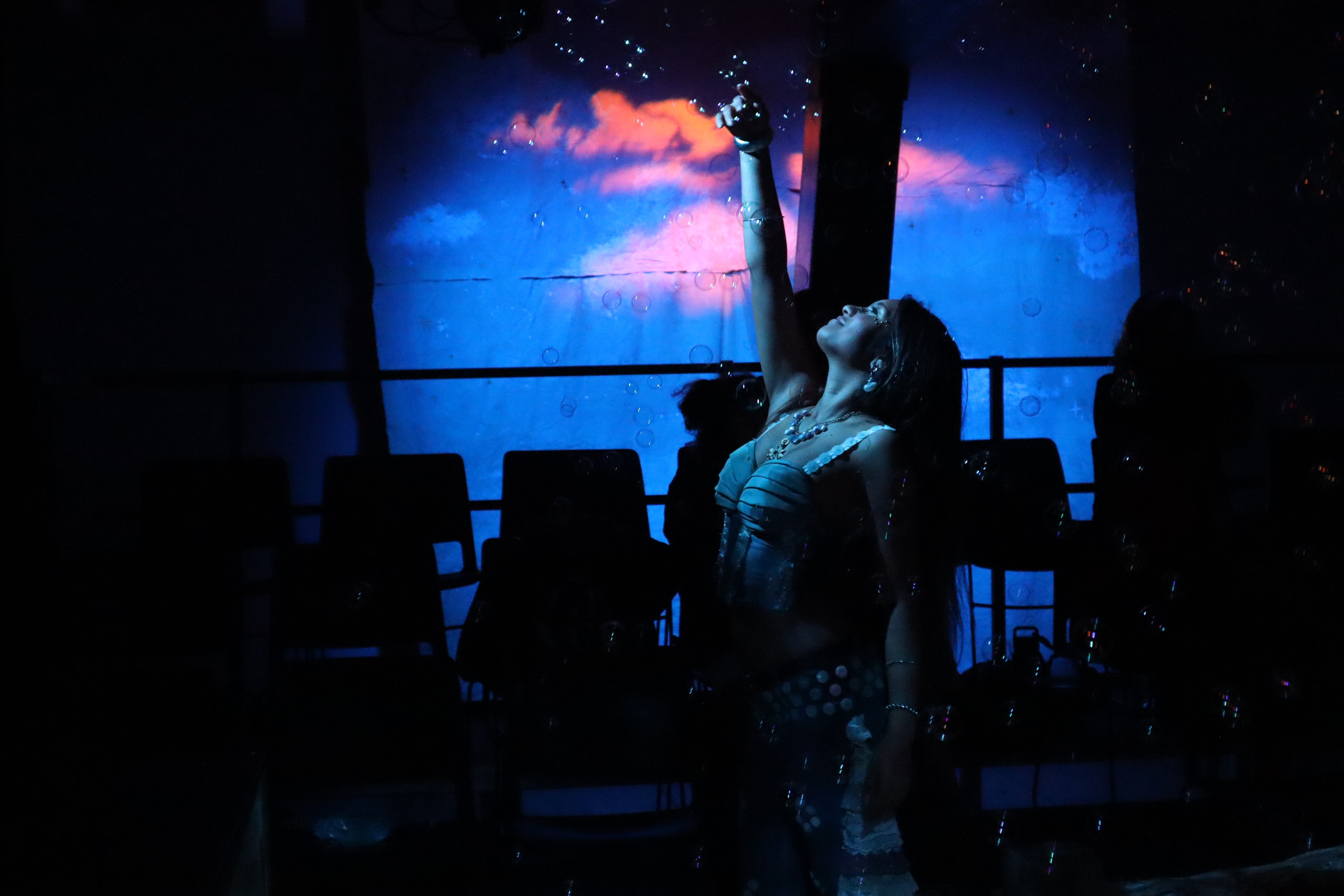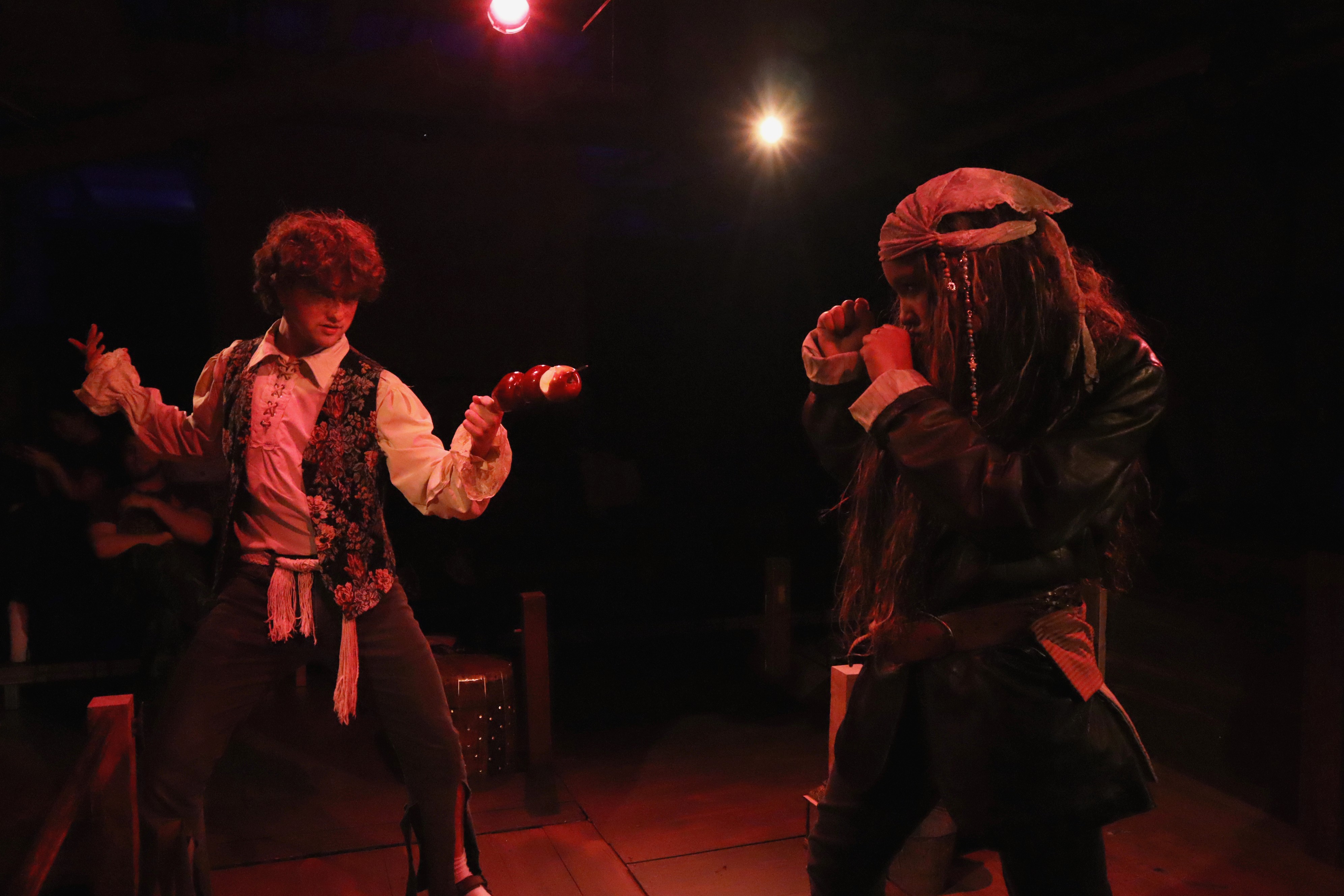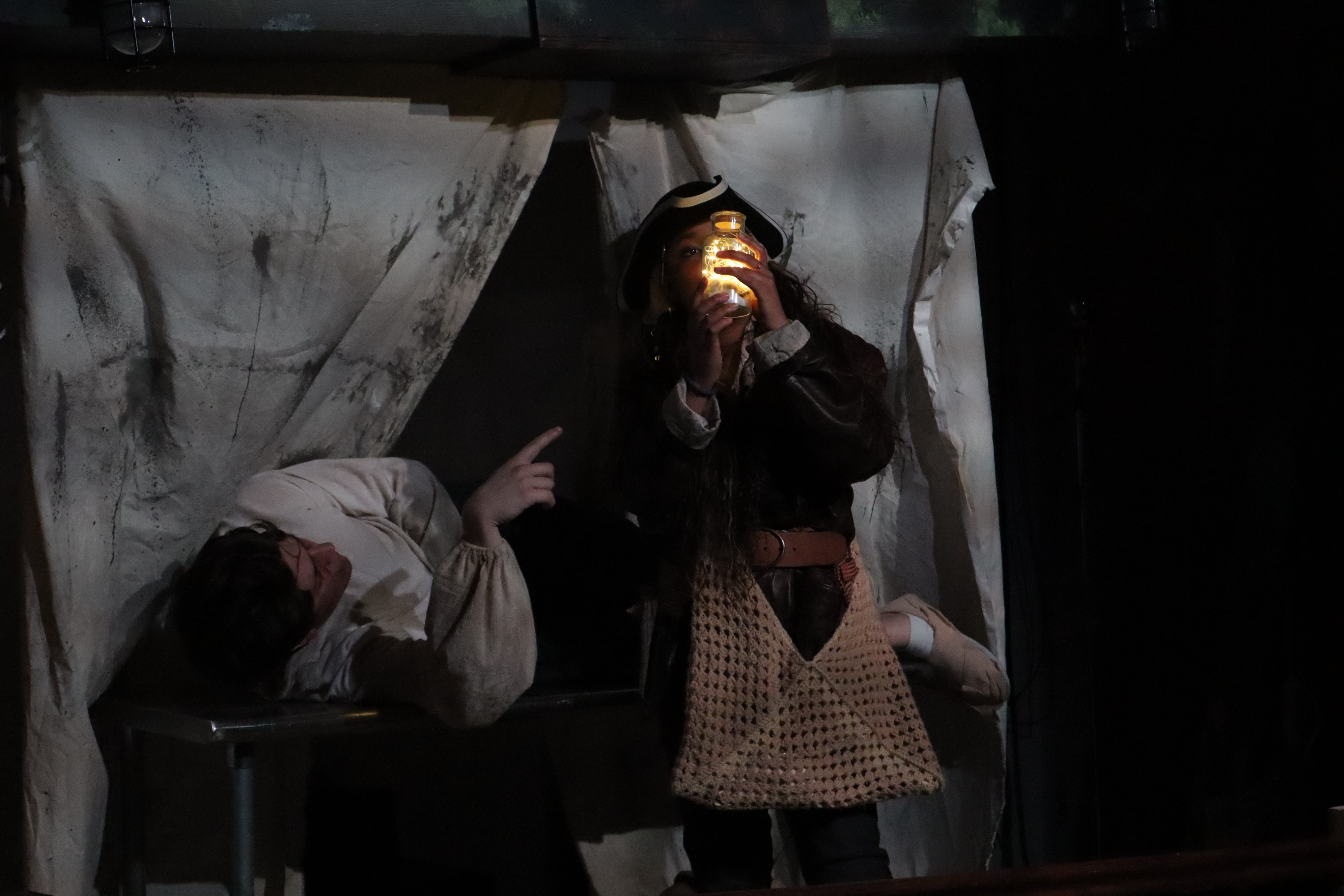 Orange Sky at Night, Sailor’s Delight is a story about Darcy, a writer, who creates a vibrant, whimsical, and fantastical Pirate World as an escapism tactic. The Siren informs the audience that an orange sky in the morning indicates a brewing storm, dangerous to sailors. Driven by grief after losing her friend Wesley, Darcy Dukes, the pirate, functions as both storm and sailor. As the storm in this metaphor, Darcy Dukes engages with a wide array of zany characters, all of which she treats as mere means to the end of reviving Wesley. Darcy Dukes cheats and steals, unrepentant in her actions. With Darcy as the sailor, her grief functions as the hungry storm, it makes her self-destructive and avoidant. Akin to how Frankenstein is created as a vessel for Darcy Dukes to house Wesley’s soul, this play is a vessel for Darcy to house her grief. So long as Darcy retains the pain of her grief, she will retain her memory of Wesley. It is just as much an act of self-flagellation as it is an act of remembrance. However, just as Darcy Dukes’ efforts to revive Wesley fail, Darcy’s efforts to encapsulate her pain also fail. Both reveal themselves to be maladaptive coping mechanisms—they help in the short term, but fail to address the root of the problem. This results in hints of reality steadily seeping into the Pirate World, as though the structural integrity of Darcy’s escapist fantasy is crumbling. This crumbling should feel unnerving. Something is wrong but Darcy Dukes cannot tell what it is, nor can the audience. Therefore, when the fantasy breaks and the sharp edges of reality crash down, it is painfully cathartic—something had to give, and finally, it does. Darcy has no other choice but to address her pain head on and allow herself vulnerability—she feeds the storm. It is only then that Darcy is able to loosen her hold on her grief, if only for a moment. The Siren informs us that there is an orange sky this night. The storm has receded, we may delight.